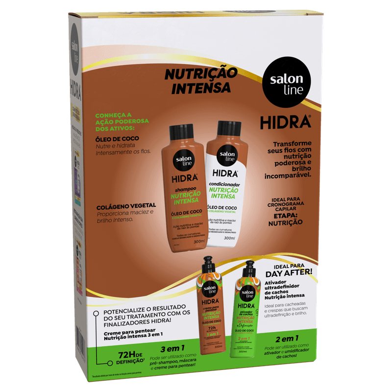 O Kit Shampoo + Condiconador Hidra Coco foi especialmente desenvolvido com ativos poderosos, que penetram na fibra capilar devolvendo a saúde dos cabelos. No leite de coco contém nutrientes, sais minerais e substâncias antioxidantes que são excelentes para hidratação. O colágeno age diretamente na parte externa do fio, selando a cutícula, proporcionando uma aparência saudável e protegendo das agressões externas.