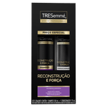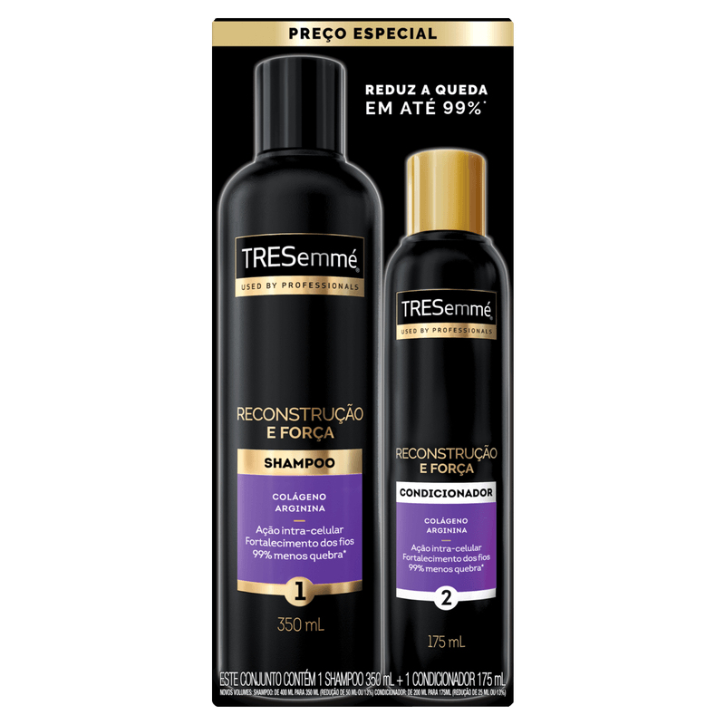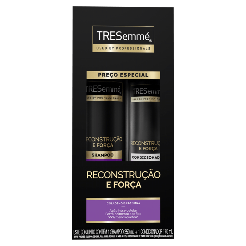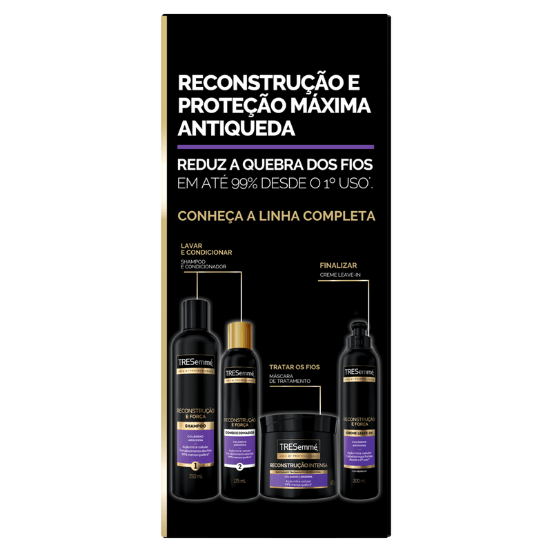 Modo de Usar: Aplique o shampoo nos cabelos molhados, massageando suavemente e enxágue bem. Em seguida, aplique o condicionador no comprimento, evitando a raiz, desembarace os fios com os dedos e enxágue completamente. Para melhores resultados, utilize a linha completa TRESemmé Reconstrução e Força.