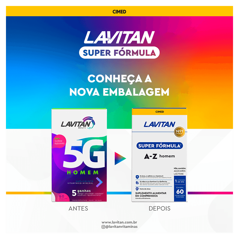 Lavitan Super Fórmula A-Z Homem é um multivitamínico completo, com 13 vitaminas e 11 minerais essenciais para a saúde masculina. Rico em zinco, cobre, vitamina E, riboflavina, selênio e vitamina C, oferece ação antioxidante e fortalece o sistema imunológico, contribuindo para o funcionamento equilibrado do organismo. Ideal para homens adultos que buscam suplementar a alimentação e manter uma vida saudável, sem adição de açúcares ou lactose.
