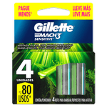 "Além das características da família Mach3 nas quais você já confia, a lâmina de barbear Mach3 Sensitive oferece uma fita lubrificante avançada* com a Tecnologia Skin Protect que protege contra irritação, mesmo em pele sensível. Para melhor performance, use em um aparelho Mach3 Sensitive.