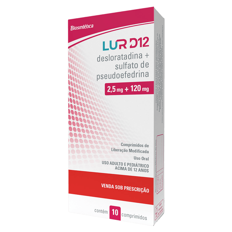 Lur D12 é um medicamento indicado para o alívio dos sintomas da rinite alérgica sazonal ou intermitente e sinusite alérgica em adultos e crianças a partir de 12 anos. Sua fórmula combina desloratadina 2,5mg, um anti-histamínico que controla espirros, coceira e coriza, com sulfato de pseudoefedrina 120mg, um descongestionante nasal eficaz na redução da congestão, proporcionando conforto e bem-estar.