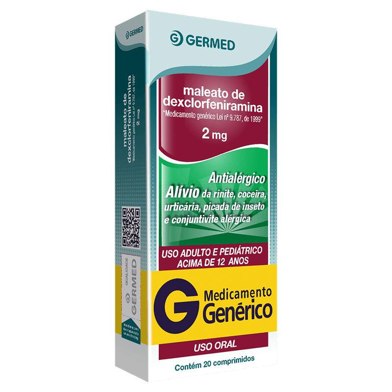 O Maleato Dexclorfeniramina 2mg Genérico é um antialérgico eficaz indicado para o alívio dos sintomas de reações alérgicas como rinite, urticária, prurido, picadas de inseto, conjuntivite alérgica, dermatite atópica e eczemas. Cada comprimido contém 2mg do princípio ativo maleato de dexclorfeniramina, garantindo ação rápida e segura para adultos e crianças acima de 12 anos. Seu uso proporciona melhora significativa na qualidade de vida, reduzindo desconfortos causados por alergias.