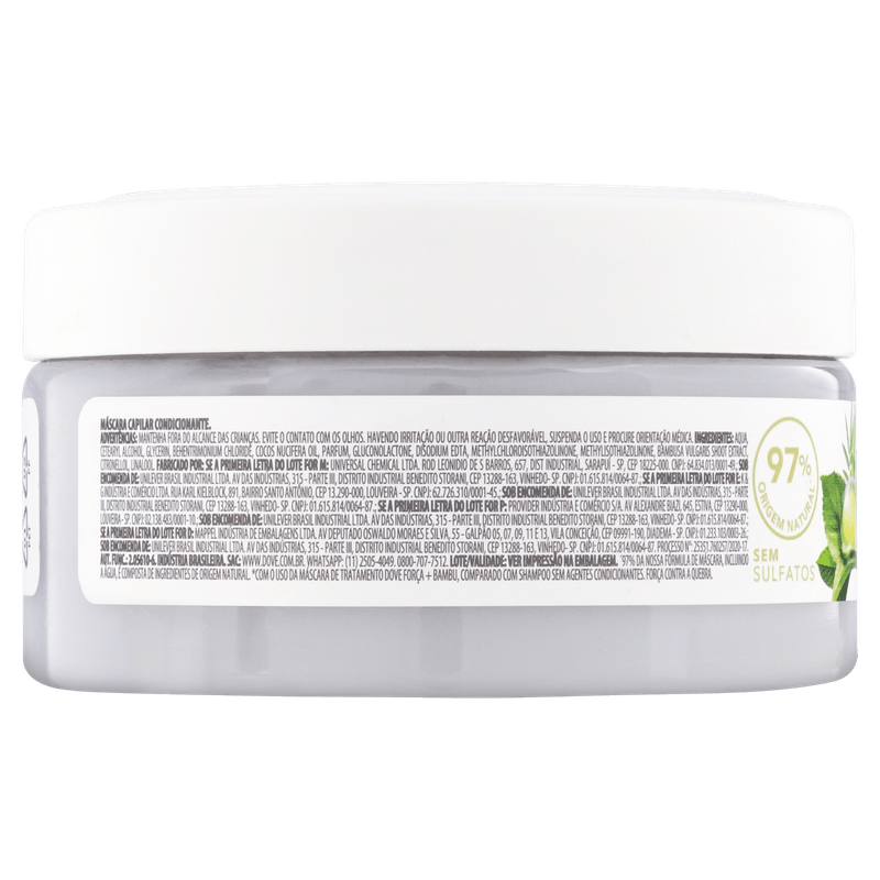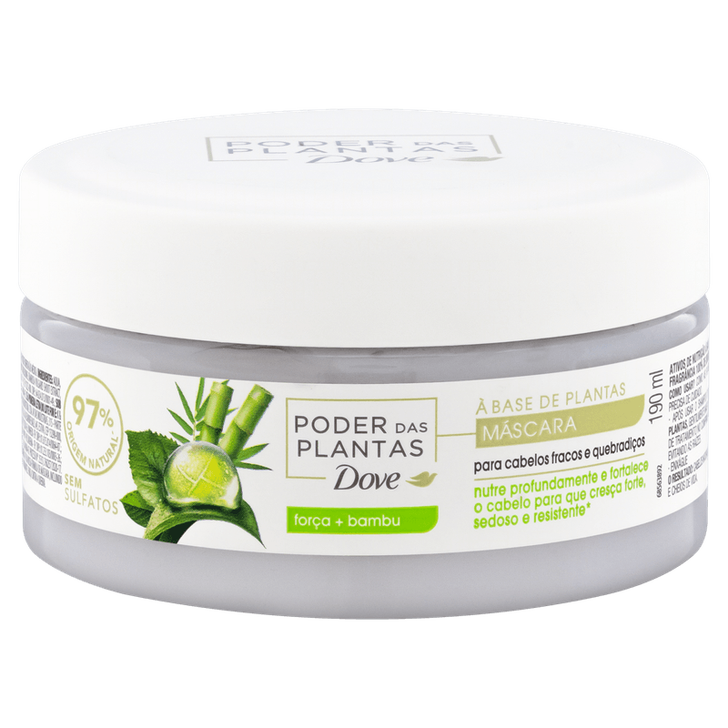Pela primeira vez, Dove combinou o poder restaurador das plantas com a sua experiência no cuidado superior para uma linha de alta performance para os cabelos. O Novo Dover Poder das Plantas traz o poder restaurador das plantas para um cabelo nutrido e saudável. A linha Dove Poder das Plantas Força + Bambu nutre e fortalece o cabelo fraco e quebradiço com o poder das plantas, desde a raiz às pontas, para que cresça forte, sedoso e resistente*. O bambu é uma planta conhecida por crescer rápido e com muita força, é rico em aminoácidos conhecidos por ajudar na reconstrução do fio. O produto ou a linha é ideal para quem precisa nutrir e fortalecer o cabelo fraco com um cuidado natural e poderoso. A máscara capilar de tratamento Dove Poder das Plantas Força + Bambu, enriquecida com óleo de coco emulsificado, nutre profundamente a fibra capilar, dando força e resistência em toda a extensão do fio. Sua fórmula com 97% de ingredientes de origem natural’, sem silicones, proporciona intenso condicionamento com a tecnologia do óleo de coco emulsificado, que potencializa os benefícios do óleo, permitindo que ele consiga penetrar e revestir de maneira mais eficiente a fibra capilar. Reabastece os lipídios perdidos, melhorando condicionamento e alinhamento, dando maciez e nutrição aos cabelos. A fragrância 100% de origem natural, traz um buquê complexo e inesquecível de ervas aromáticas enriquecido com notas amadeiradas, que proporcionam experiência única durante o banho. Os frascos são 100% de plástico reciclado e reciclável, ou seja, este frasco tem história, já foi outra embalagem e agora vai para a sua casa como Dove Poder das Plantas. Por ser 100% reciclável, a história deste frasco pode continuar, basta reciclar. Bem como todos os produtos da marca, Dove não testa em animais em nenhum lugar do mundo. Dúvidas de como usar? Após usar o Shampoo e Condicionador Dove Poder das Plantas Força + Bambu, massageie gentilmente o creme de tratamento no comprimento do cabelo, evitando as raízes. Deixe agir por 3 minutos. Enxágue. O resultado: cabelos naturalmente saudáveis e cheios de vida. Para intensificar o poder restaurador das plantas, use a linha inteira de Força + Bambu. O shampoo sem sulfatos traz uma limpeza suave e eficaz, e o condicionador também traz a tecnologia do óleo de coco enriquecido, que potencializa os benefícios do óleo, permitindo que ele consiga penetrar e revestir de maneira mais eficiente a fibra capilar, para cabelos mais resistentes e sedoso da raiz às pontas Experimente o cuidado de Dove poder das Plantas, que trabalha em harmonia com a naturalidade do cabelo adicionando nutrição para um cabelo visivelmente saudável. Conheça as outras linhas de Dove Poder das Plantas: Nutrição + Gerânio e Purificação + Gengibre. *Com o uso do creme hidratante / mascara de Tratamento, Shampoo e Condicionador Dove Força + Bambu, comparado com shampoo sem agentes condicionantes. ‘97% da nossa fórmula de máscara de tratamento, incluindo a água, é composta de ingredientes de origem natural. - Pode ser usado na rotina de cronograma capilar.