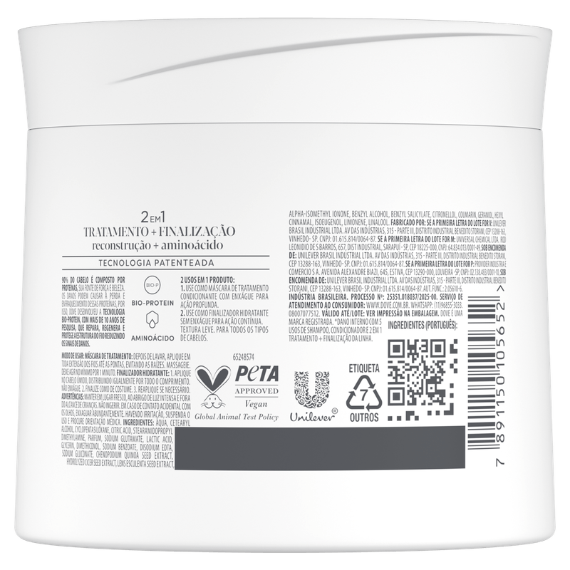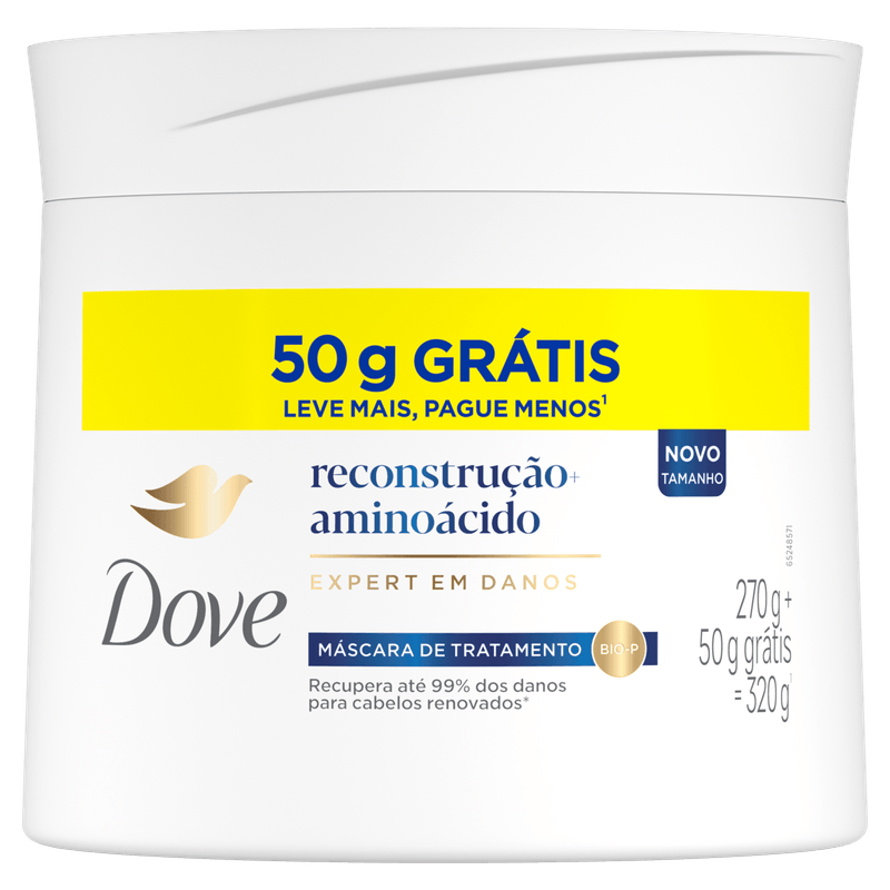 A Máscara de Tratamento Dove Reconstrução + Aminoácido é ideal para cabelos danificados, quebradiços e sem vida. Sua fórmula cremosa penetra profundamente, promovendo uma reconstrução intensa e fortalecendo os fios desde a raiz até as pontas, devolvendo vitalidade e resistência aos cabelos fragilizados.