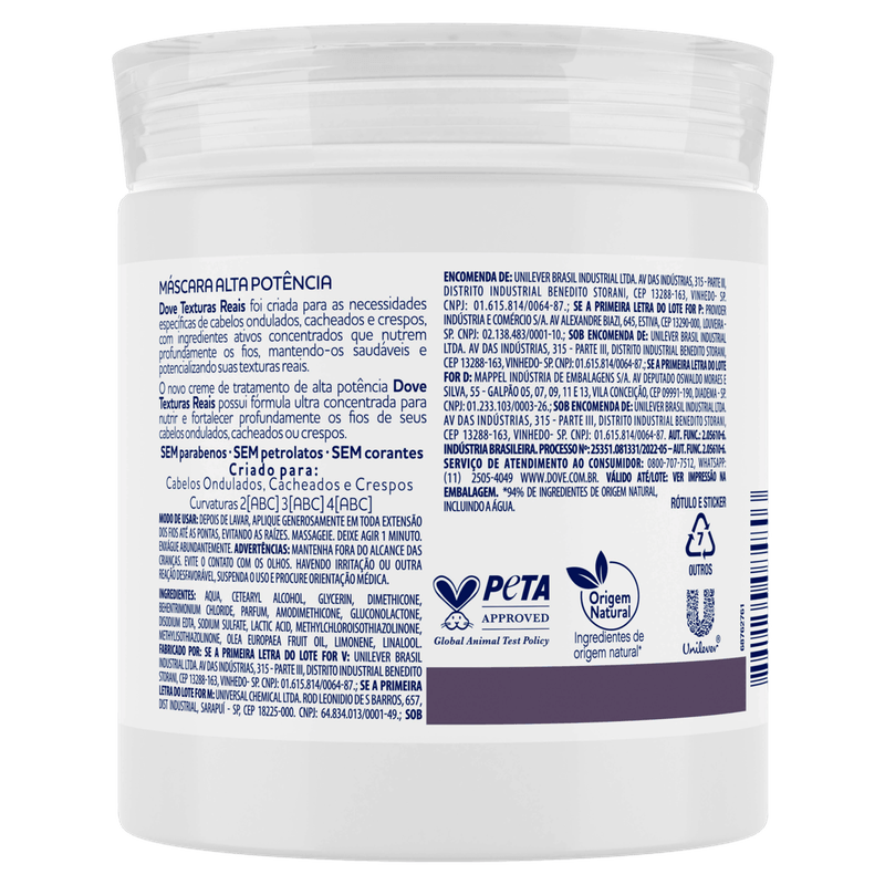 Dove Texturas Reais foi criada para as necessidades específicas de cabelos ondulados, cacheados e crespos, com ingredientes ativos concentrados que nutrem profundamente os fios, mantendo-os saudáveis e potencializando suas texturas reais. A Máscara de Tratamento Dove Texturas Reais Alta Potência, proporciona ultra nutrição e fortalecimento aos cabelos ondulados, cacheados e crespos. Desenvolvido com ingredientes ativos concentrados, como o azeite de oliva, esta máscara capilar nutre e fortalece profundamente os cabelos com todo o tipo de curvaturas. Essa Máscara Alta Potência é feita com ingredientes de origem natural** e não possui na sua fórmula parabenos, petrolatos e corantes, para nutrir e dar maciez aos cabelos. Dove Texturas Reais foi criada para cabelos ondulados, cacheados e crespos com Curvatura 2; 3; 4 [ABC], deixando-os lindos e saudáveis. Para obter mais textura em seus cabelos, após lavar, aplique generosamente em toda extensão dos fios até às pontas, evitando as raízes. Deixe agir 1 minuto e enxágue abundantemente. Pode usar esta máscara de tratamento de uso individual ou para misturar com Boosters Dove em seu cronograma capilar. Experimente toda a linha Dove Texturas Reais para potencializar a textura dos seus cabelos. Todos os produtos Dove são livres de crueldade animal e certificados pela PETA. Globalmente, a Dove não faz testes em animais em nenhum lugar do mundo. Nossa missão é garantir que a próxima geração cresça desfrutando de um relacionamento positivo com sua própria aparência, ajudando jovens a aumentarem sua autoestima e desenvolverem todo seu potencial. A diferença de Dove feita com cuidado. *94% de ingredientes de origem natural, incluindo a água.