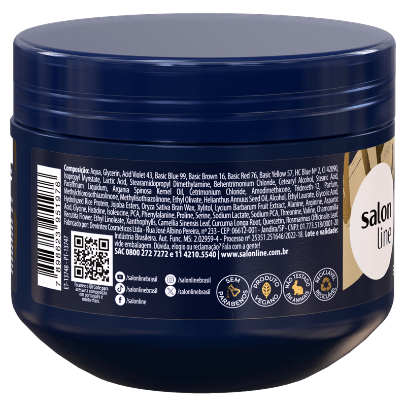 Modo de Usar: Com o cabelo limpo e úmido, aplique a máscara mecha por mecha, massageando do couro cabeludo às pontas. Deixe agir de 5 a 10 minutos e enxágue bem.