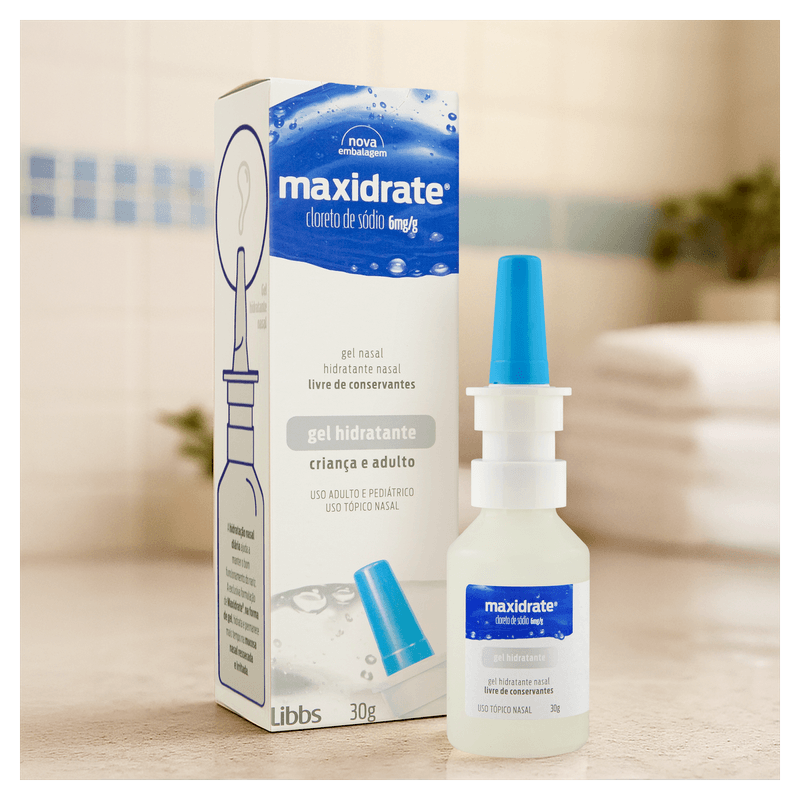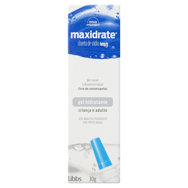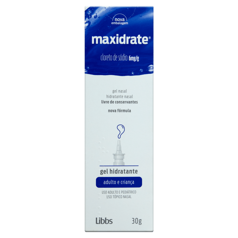 Maxidrate Gel 6mg/g Libbs é um hidratante nasal em gel de 30g, indicado para aliviar a mucosa nasal ressecada e irritada em crianças e adultos. Sua fórmula contém 6mg de cloreto de sódio por grama, promovendo hidratação prolongada que previne crostas, sangramentos e facilita a limpeza das vias aéreas ao eliminar impurezas, bactérias e agentes irritantes. Ideal para quem sofre com resfriados, alergias, clima frio, baixa umidade, poluição ou exposição ao ar-condicionado.