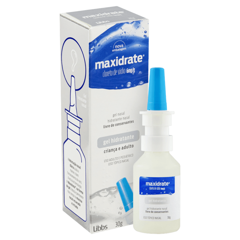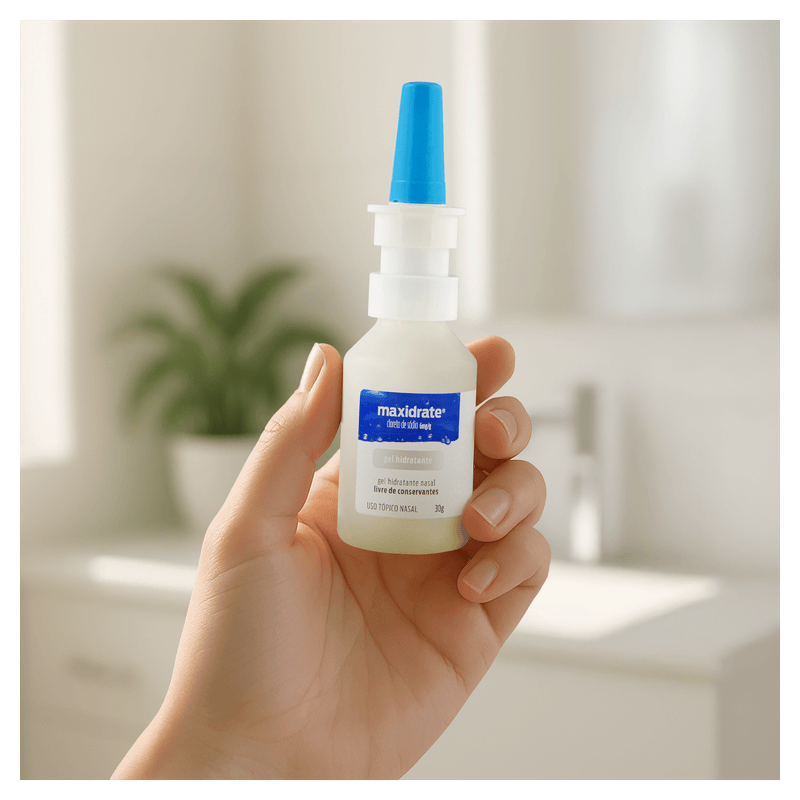 Maxidrate Gel atua hidratando profundamente a mucosa nasal, proporcionando conforto respiratório e proteção contra ressecamento. Apresenta textura em gel, sem sabor, e é de uso exclusivamente nasal, sem necessidade de prescrição médica. A embalagem contém 30g do produto, que é seguro para uso durante a gravidez e indicado para todas as idades a partir de crianças. Mantenha fora do alcance das crianças e não ingira.