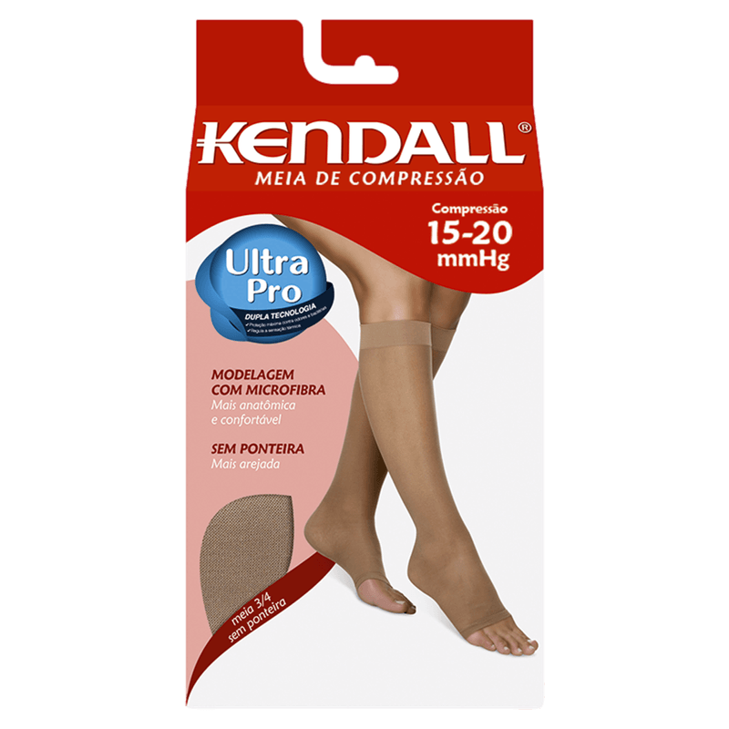 A Meia de Compressão Kendall 3/4 sem ponteira, na cor mel e tamanho médio, oferece compressão graduada de 15-20 mmHg, ideal para melhorar a circulação sanguínea e favorecer o retorno venoso. Com maior pressão no tornozelo que diminui até a panturrilha, é indicada para prevenção e tratamento de inchaço, cansaço, varizes, trombose venosa profunda e outras condições venosas ou linfáticas. Seu público-alvo inclui pessoas que passam longos períodos em pé ou sentadas, gestantes, pacientes no pós-operatório e quem possui predisposição hereditária a problemas circulatórios.