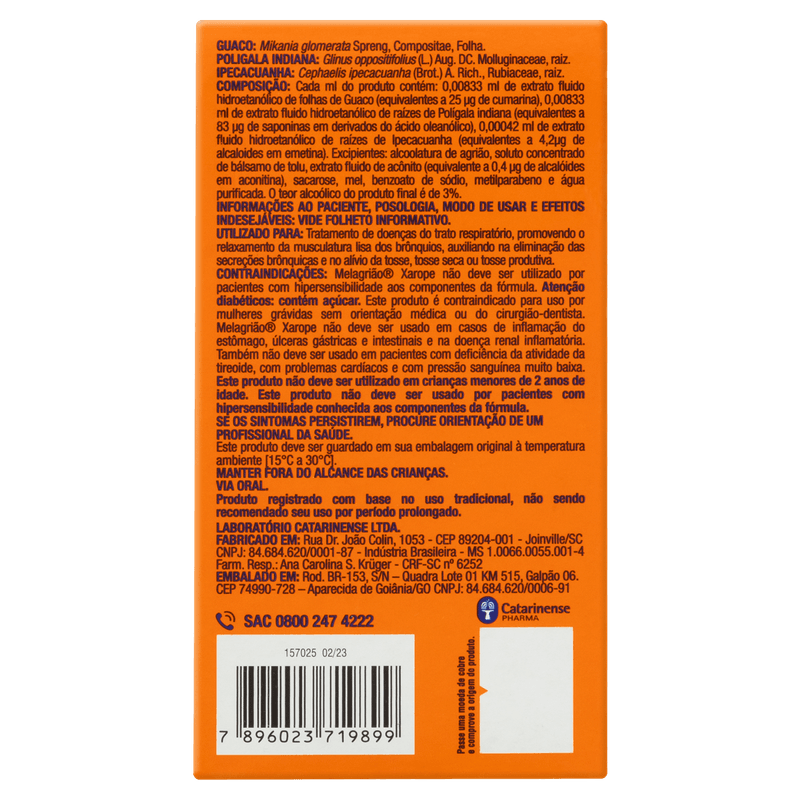 O Xarope Expectorante Melagrião Caixa 150ml é um fitoterápico indicado para o tratamento de bronquite alérgica e estados gripais que afetam as vias respiratórias, aliviando tanto a tosse seca quanto a produtiva. Sua fórmula combina extratos fluido hidroetanólicos de folhas de guaco, raízes de Polígala indiana e raízes de ipecacuanha, que promovem o relaxamento da musculatura dos brônquios e facilitam a eliminação das secreções, proporcionando alívio eficaz e natural.