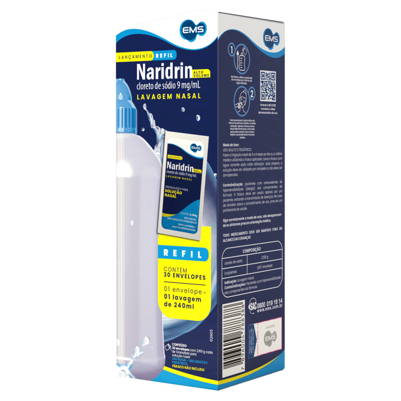 Naridrin Alto Volume Refil é um granulado para reconstituição que oferece uma solução isotônica de cloreto de sódio a 0,9%, ideal para lavagem nasal. Indicado para adultos e crianças acima de 2 anos, promove a limpeza e hidratação da mucosa nasal, auxiliando na remoção de secreções, alérgenos e impurezas. É eficaz no alívio da congestão causada por gripes, resfriados, rinite alérgica e sinusite, além de ser recomendado para higiene nasal diária e cuidados pós-operatórios.