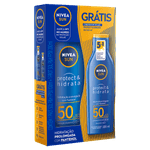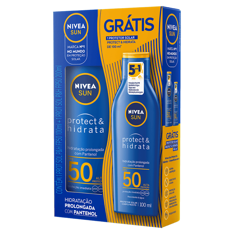 O Kit Protetor Solar Nivea Sun Protect & Hidrata FPS 50 é composto por dois protetores solares em loção, com embalagens de 200 ml e 100 ml. Oferece alta proteção contra os raios UVA e UVB, com fórmula oil free que hidrata a pele durante a exposição solar.