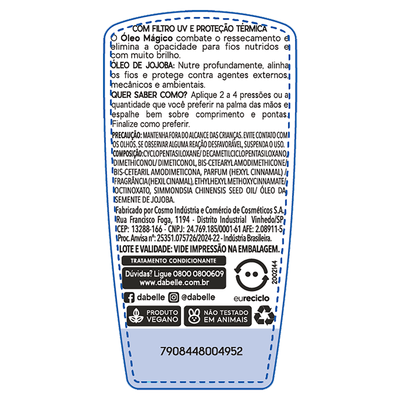 O Óleo de Jojoba Intense Mágico DaBelle Hair é um tratamento nutritivo essencial para cabelos ressecados e opacos. Com fórmula enriquecida, ele nutre profundamente, alinha os fios e oferece proteção contra agentes externos, mecânicos e ambientais, além de contar com filtro UV e proteção térmica para manter seus cabelos saudáveis e brilhantes.