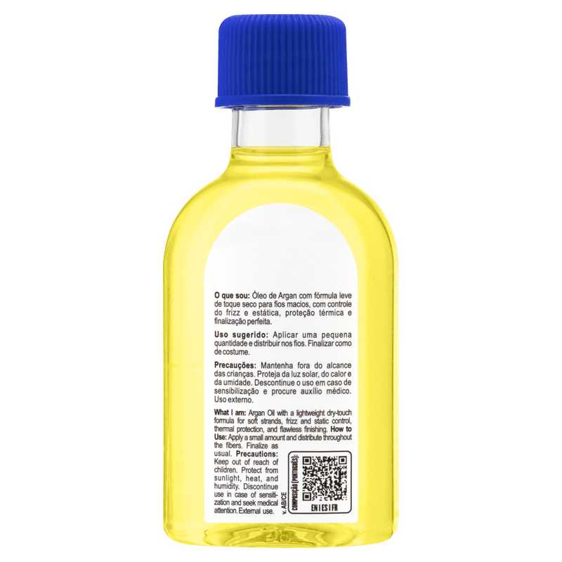 O que sou: óleo de Argan com fórmula leve de toque seco para fios macios, com controle do frizz e estática. O que mais você precisa saber: Tenho proteção térmica com finalização perfeita. Uso sugerido Aplicar uma pequena quantidade e distribuir nos fios. Finalizar como de costume.