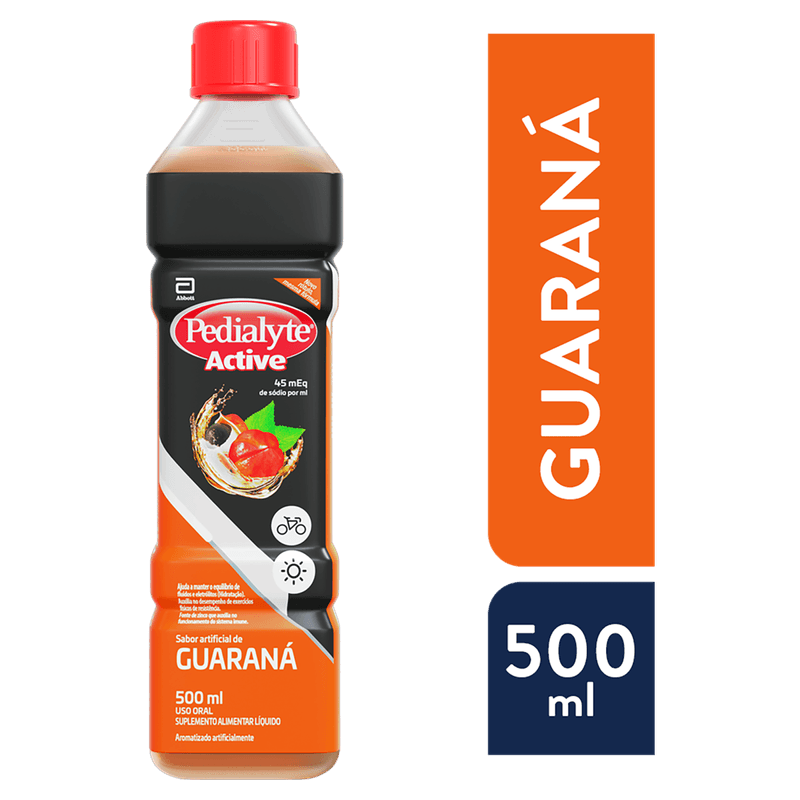 Pedialyte Plus Guaraná apresenta-se em solução oral com volume de 500 ml, textura líquida e sabor guaraná. Contém água, sais minerais (incluindo sódio e zinco), corante e aromatizante sintético idêntico ao natural, com baixo valor energético. Indicado para reposição rápida e eficaz de eletrólitos e fluidos, atua na manutenção da hidratação e no suporte ao sistema imunológico. Produto sem tarja, venda livre, adequado para uso durante a gravidez e para faixas etárias pediátricas e adultas conforme recomendação médica.
