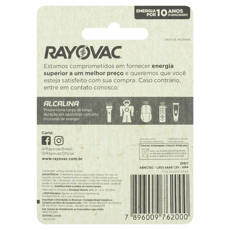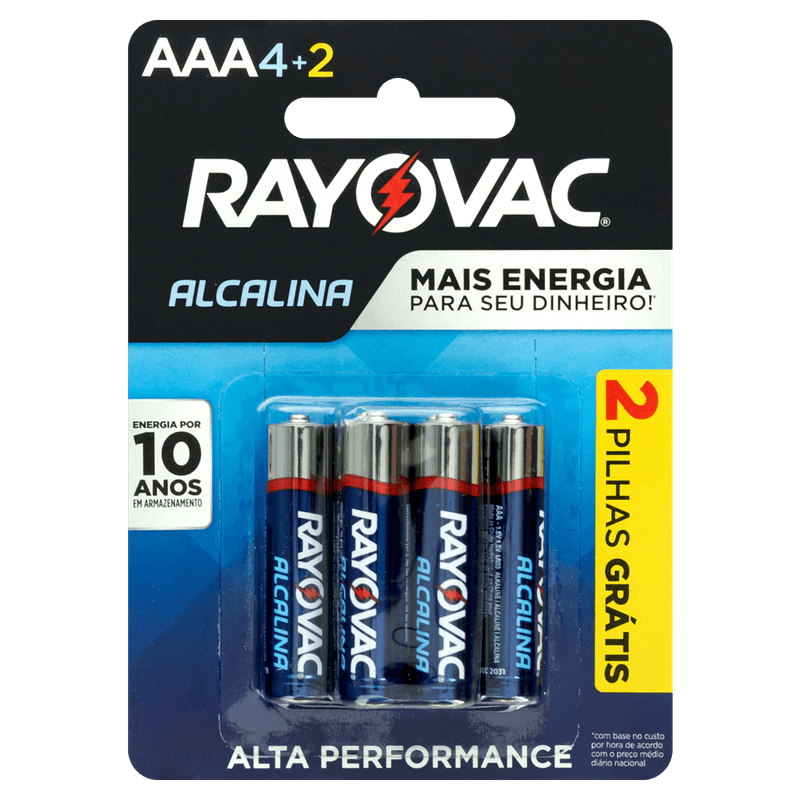 Pilha Alcalina AAA Rayovac 6 Unidades 1,5V Grátis 2 Pilhas