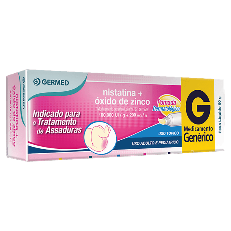 A Pomada para Assaduras Nistatina + Óxido de Zinco Germed 60g é um dermatológico indicado para o tratamento e prevenção de assaduras em bebês e adultos, especialmente aquelas causadas pelo uso de fraldas. Sua fórmula combina Nistatina, um antifúngico eficaz contra infecções fúngicas como a candidíase, e Óxido de Zinco 20%, que atua como cicatrizante e protetor, formando uma barreira que reduz a irritação e o contato da pele com agentes agressivos.