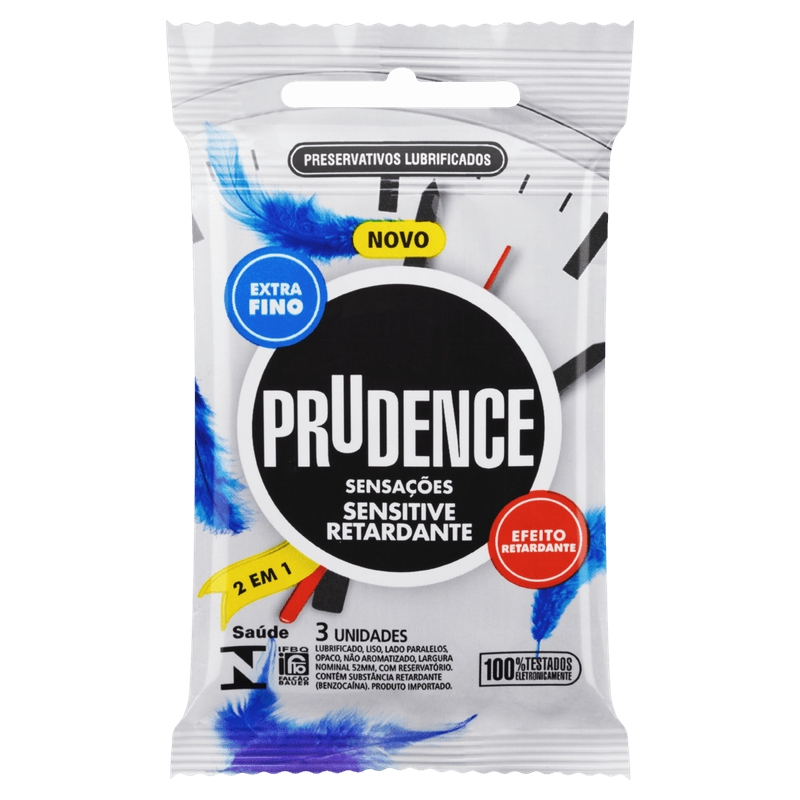 O Preservativo Masculino Sensações Retardante Prudence é um produto lubrificado feito de borracha de látex natural vulcanizada, disponível em embalagem com 3 unidades. Sua principal finalidade é oferecer proteção durante a relação sexual, ajudando no planejamento familiar e na prevenção de infecções sexualmente transmissíveis, com efeito retardante proporcionado pela benzocaína.