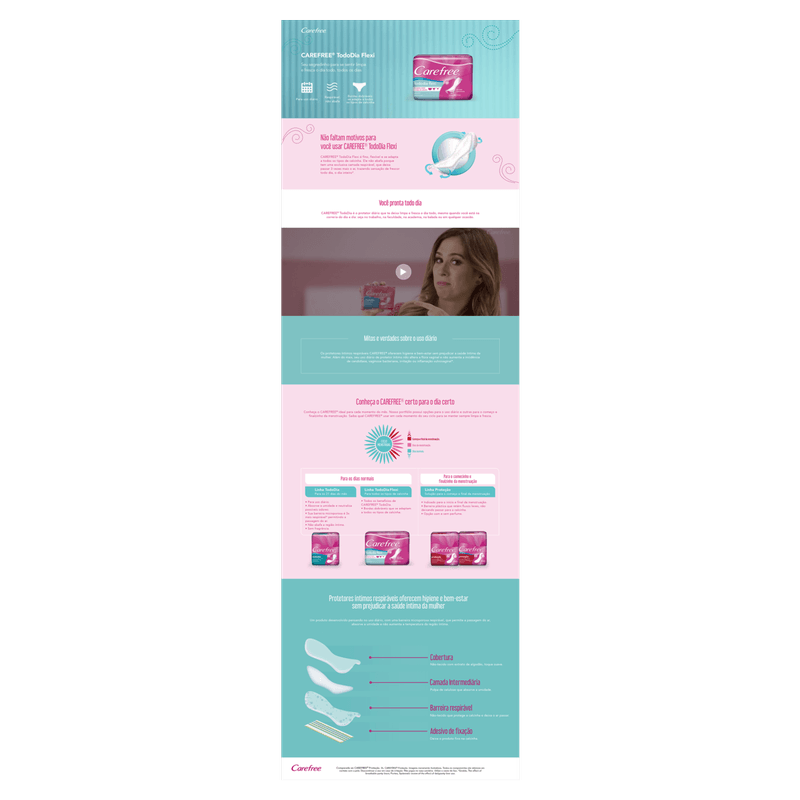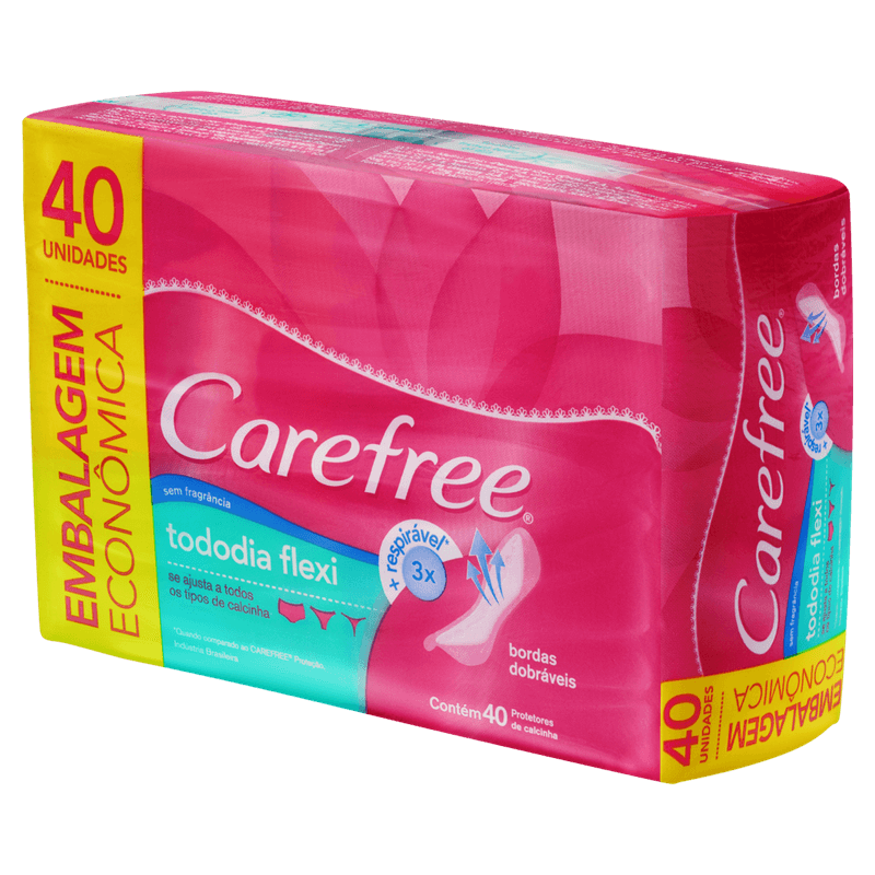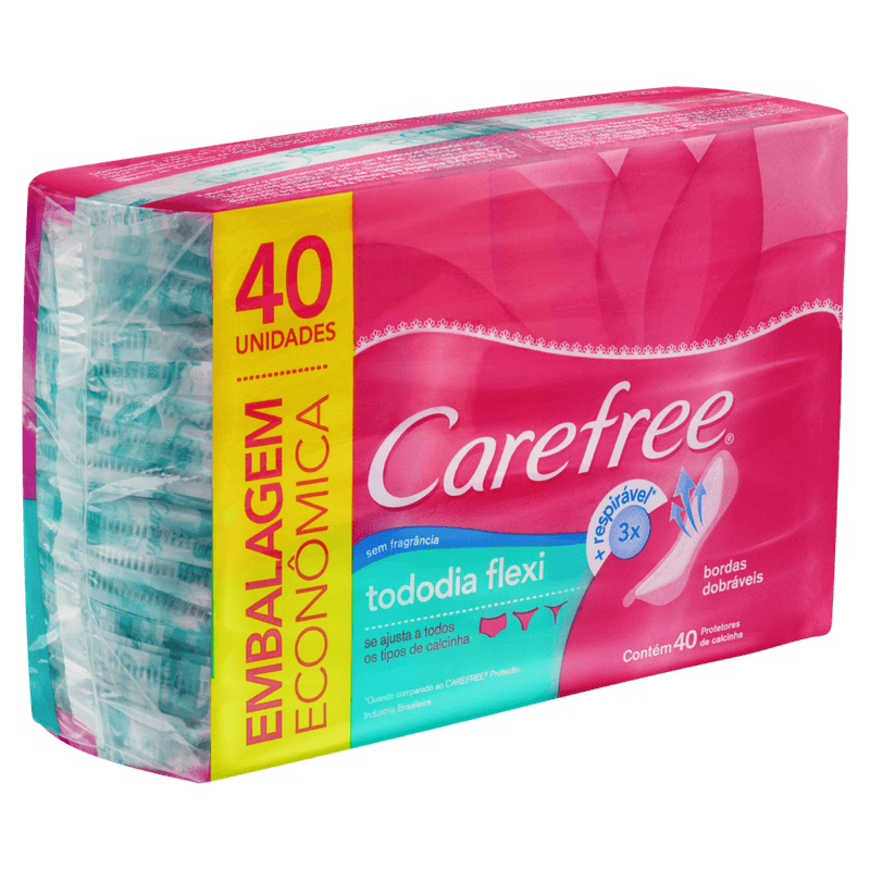 O Absorvente diário Carefree todo dia flexi é fino, flexível e adapta a todos os tipos de calcinha, ele não abafa porque tem uma exclusiva camada respirável, que deixa passar 3 vezes mais o ar, trazendo sensação de frescor todo dia, o dia inteiro. Fino, flexível e adapta a todos os tipos de calcinha e não abafa. Exclusiva camada respirável, que deixa passar 3 vezes mais o ar. Sensação de frescor todo dia, o dia inteiro