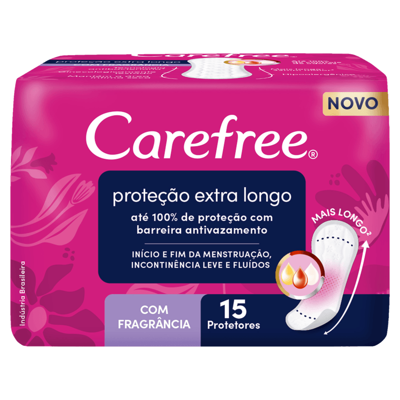 CAREFREE® Proteção Extra Longo é ideal para início e fim de menstruação, incontinência leve e fluxos do dia a dia. Com sua barreira antivazamento, ele oferece até 100% de proteção e controle de odores, mantendo a área íntima seca. Com design mais longo, 32mm maior que Carefree Proteção, ele garante mais segurança e absorção.