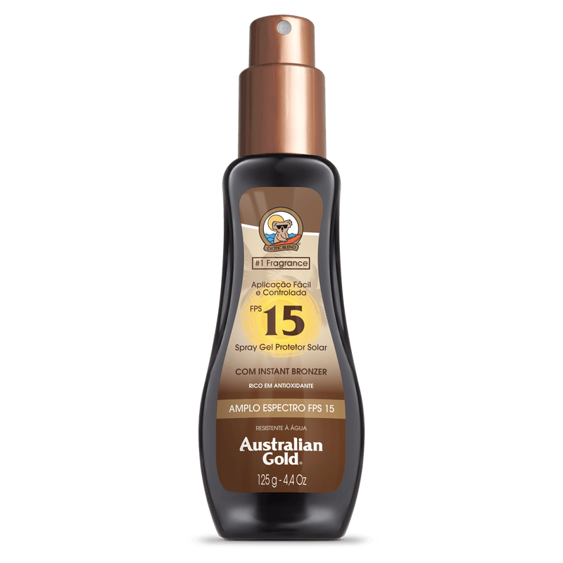 O Protetor Solar Instant Bronzer Spray Gel FPS 15 Australian Gold é um protetor solar em gel com aplicação em spray, que oferece proteção contra os raios UVA e UVB, indicado para peles que bronzeiam facilmente sem vermelhidão. Sua fórmula proporciona um bronzeado instantâneo com efeito dourado e é resistente à água.