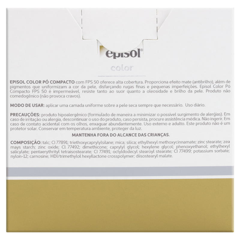 O Pó Compacto Episol Color FPS 50 Pele Clara é um protetor solar em pó compacto indicado para peles claras, que oferece alta proteção contra os raios UVA, UVB, luz visível e radiação infravermelha. Apresenta efeito mate, toque seco e cobertura natural, controlando o suor e a oleosidade da pele.
