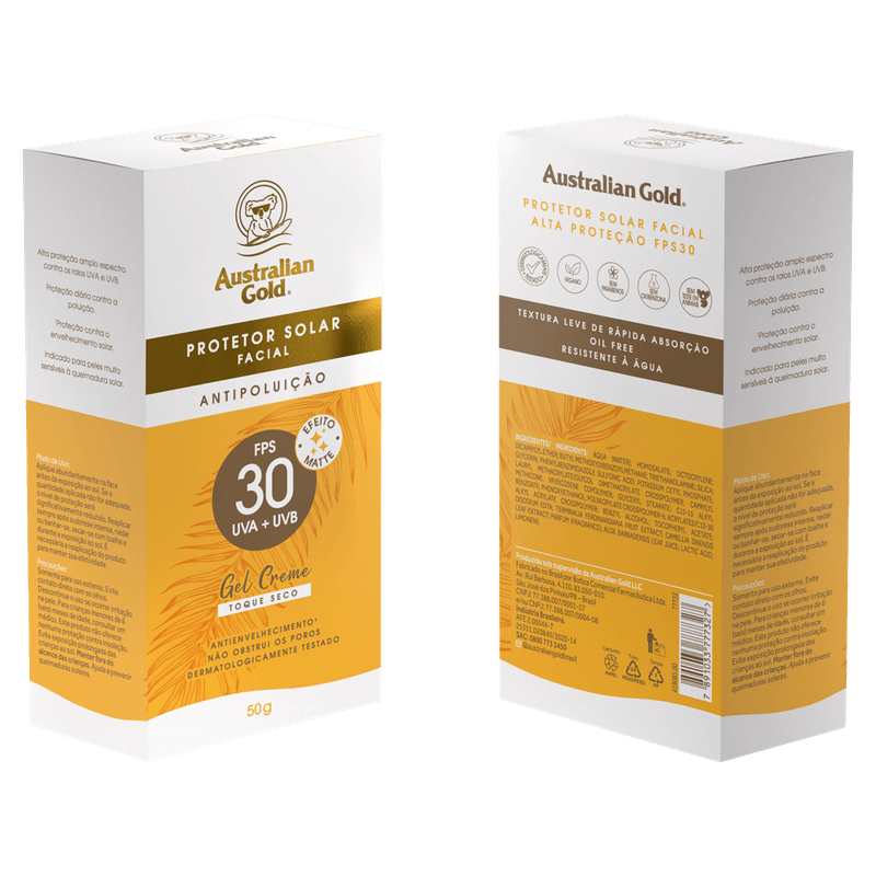 O Protetor Solar Facial Gel Creme Toque Seco FPS 30 Australian Gold, em embalagem de 50g, é um protetor solar facial com textura gel creme e toque seco, indicado para proteção contra os raios UVA e UVB, além de oferecer ação antipoluição.