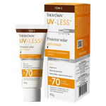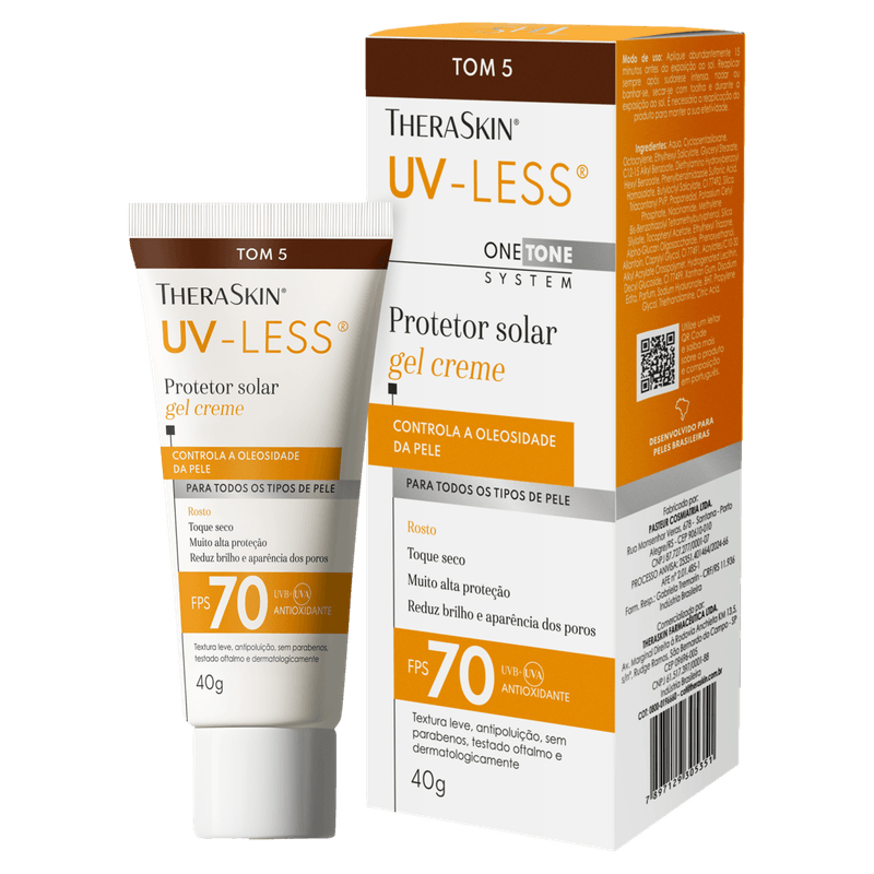 O Protetor Solar Facial Theraskin UV-Less FPS 70 Cor 5 é um gel-creme de toque seco especialmente formulado para peles negras retintas. Com alta proteção contra os raios UVA e UVB, oferece FPS 70 para garantir segurança eficaz contra os danos solares. Sua fórmula enriquecida com niacinamida, vitamina E, ácido hialurônico e alantoína promove hidratação profunda, ação antioxidante, efeito calmante e ajuda a uniformizar o tom da pele, além de controlar a oleosidade, proporcionando um acabamento leve e seco.