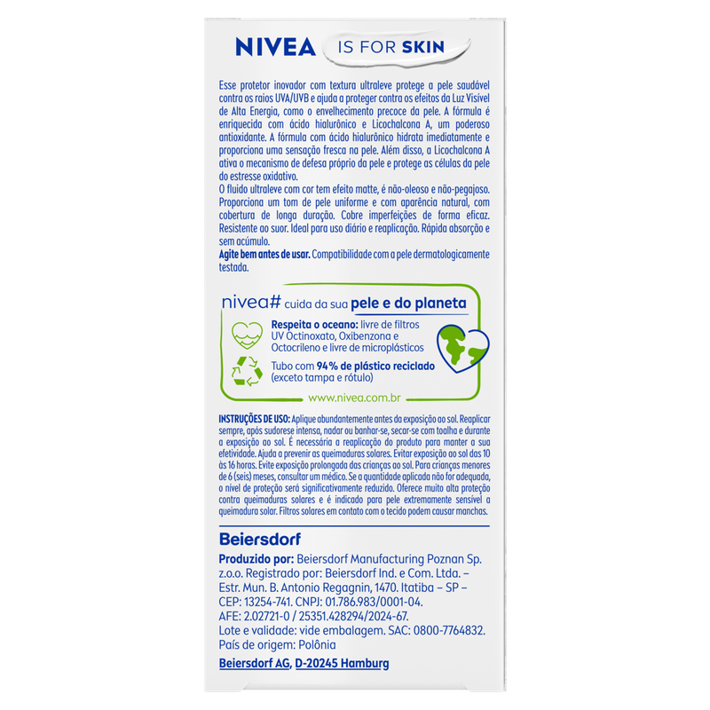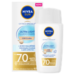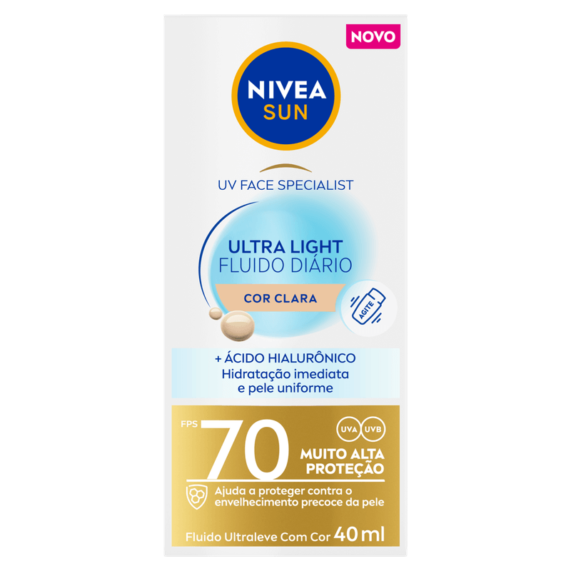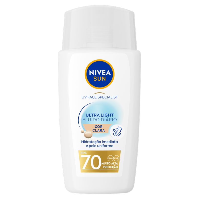 O Protetor Solar Facial Ultralight Fluido Cor Clara FPS 70 da Nivea oferece alta proteção contra os raios UVA e UVB, ideal para quem busca cuidado diário com a pele do rosto. Sua fórmula ultraleve, enriquecida com ácido hialurônico e Licochalcona A, proporciona hidratação imediata, efeito matte e uniformiza o tom da pele com uma cobertura natural e duradoura, sem oleosidade ou sensação pegajosa. Indicado para todos os tipos de pele, especialmente para quem deseja proteção eficaz aliada a um acabamento leve e com cor clara.