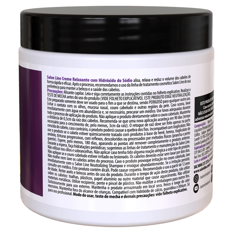 Modo de usar: Utilize o Creme Relaxante Salon Line Hidróxido de Sódio 400g como última etapa do cuidado capilar, após lavar e finalizar o cabelo. Aplique conforme as instruções específicas para relaxamento, respeitando o tempo indicado para evitar danos.