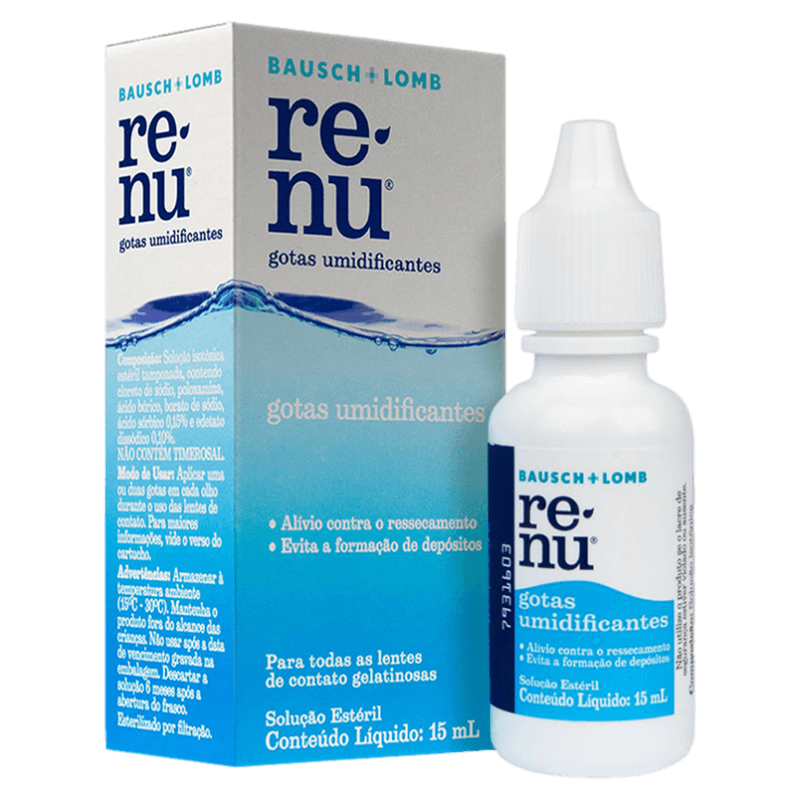 Renu Umidificante Gotas 15ml é um medicamento indicado para umidificar lentes de contato gelatinosas, proporcionando alívio eficaz do ressecamento ocular e maior conforto durante o uso prolongado. Sua fórmula com Polivinilpirrolidona (PVP) evita a formação de depósitos nas lentes, garantindo visão clara e sensação refrescante. Ideal para usuários de lentes que buscam conforto e proteção contra irritações causadas pelo uso contínuo.
