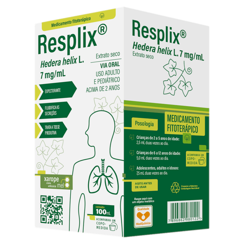 Resplix contém 7 mg/ml de extrato seco de Hedera helix L., equivalente a 0,84 mg/ml de hederacosídeo C, substância responsável pela ação mucolítica e expectorante. O produto apresenta textura líquida em forma de xarope, com volume de 100 ml por embalagem. É contraindicado para crianças menores de 2 anos e para pessoas com hipersensibilidade a qualquer componente da fórmula. A venda é sob prescrição médica, reforçando a importância do acompanhamento profissional durante o tratamento.