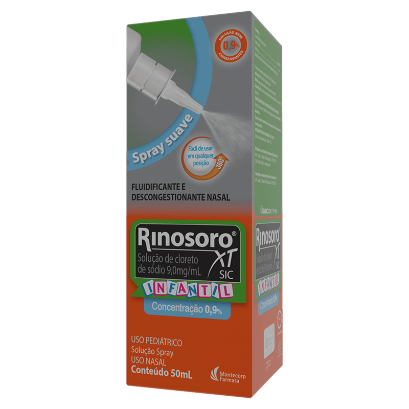 Rinosoro XT SIC Infantil é um descongestionante nasal de venda livre, registrado na Anvisa sob o número 879087, com apresentação em spray de 50 ml. Sua fórmula contém solução de cloreto de sódio 9,0 mg/ml, sem sabor e com textura líquida adequada para nebulização nasal. Indicado para fluidificar e descongestionar as vias nasais em crianças, é um produto seguro e fácil de usar, que contribui para o alívio dos sintomas respiratórios comuns na infância. Este medicamento é isento de prescrição médica. Mantenha fora do alcance das crianças.