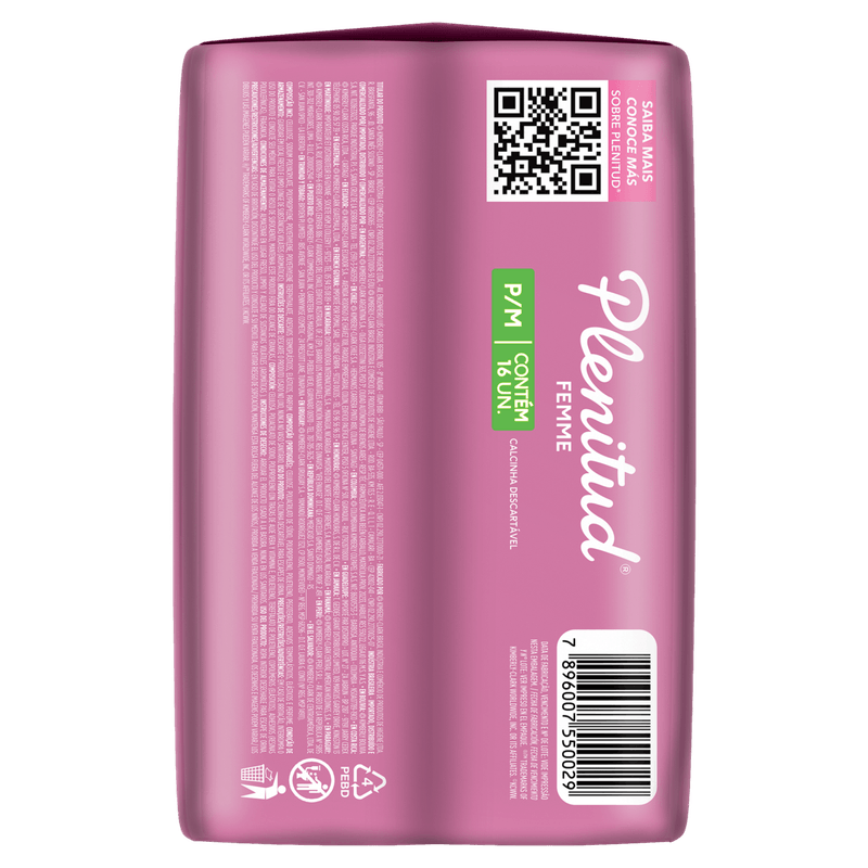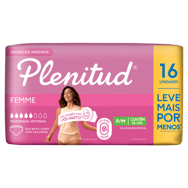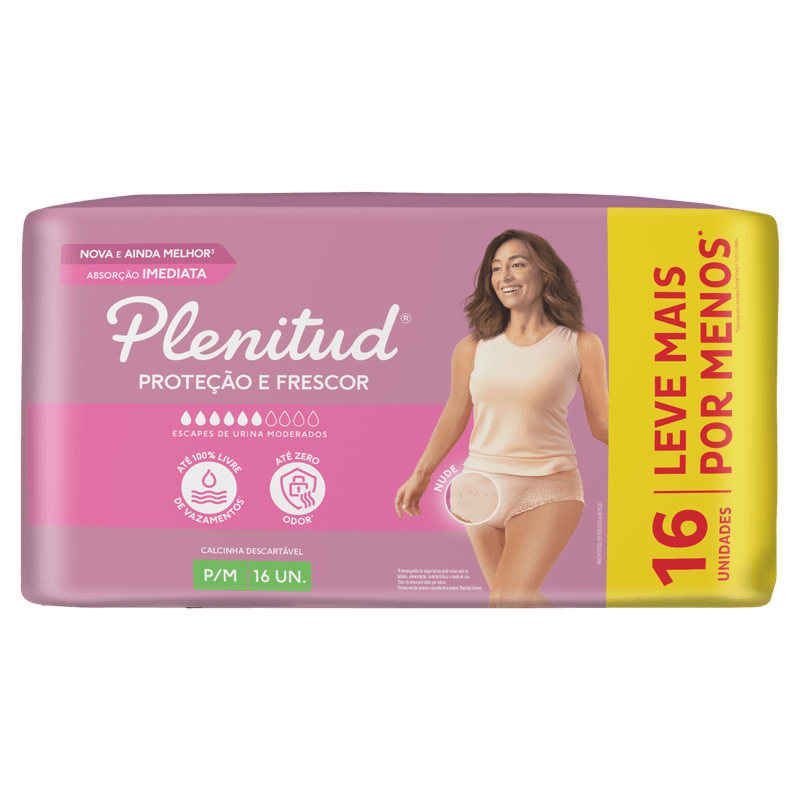 Fabricada com lycra, polipropileno, polímero superabsorvente, celulose e resinas poliolefínicas, a Plenitud Active oferece alta absorção e conforto, com textura macia e ajuste anatômico. A embalagem contém 16 unidades, ideal para uso diário. Recomendado para manequins do 34 ao 44 (cintura de 86 a 117 cm). Produto feminino, descartável, com tecnologia que une absorção rápida e controle de odor para garantir proteção e bem-estar durante toda a rotina.
