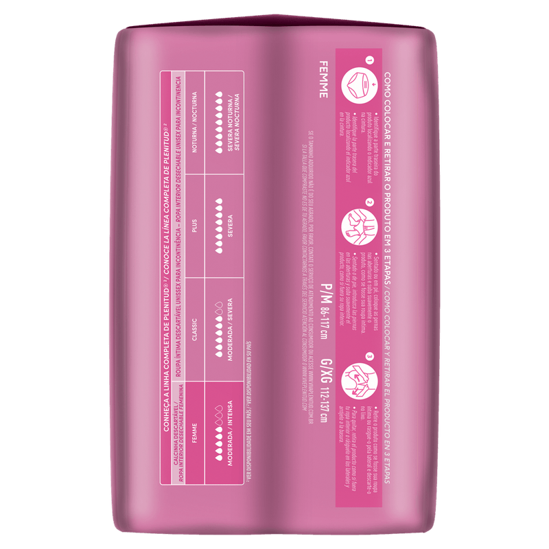 A Roupa Íntima Plenitud Active para mulheres, tamanho M, é a solução prática e confortável para incontinência urinária leve a moderada. Com ajuste perfeito ao corpo, semelhante a uma calcinha comum, oferece discrição e segurança para o dia a dia ativo. Seu diferencial está na absorção rápida e eficiente, cinco vezes maior que um absorvente feminino regular, além do controle de odores que garante frescor prolongado. Ideal para mulheres que buscam proteção confiável com conforto e preço acessível.