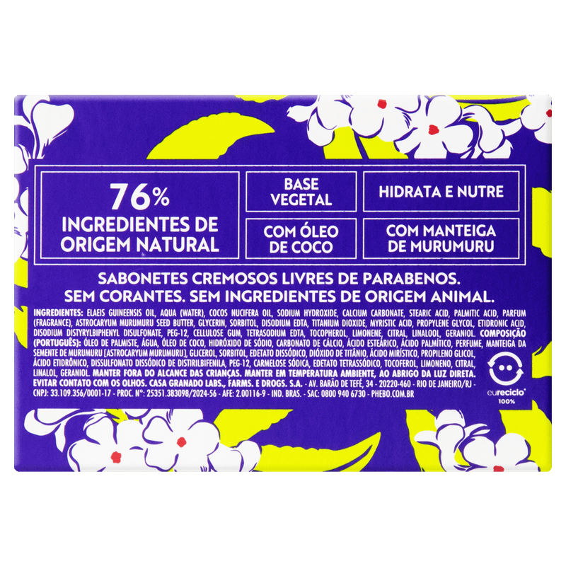 • Composição: 76% ingredientes de origem natural, sem ingredientes de origem animal, com óleo de coco e manteiga de murumuru