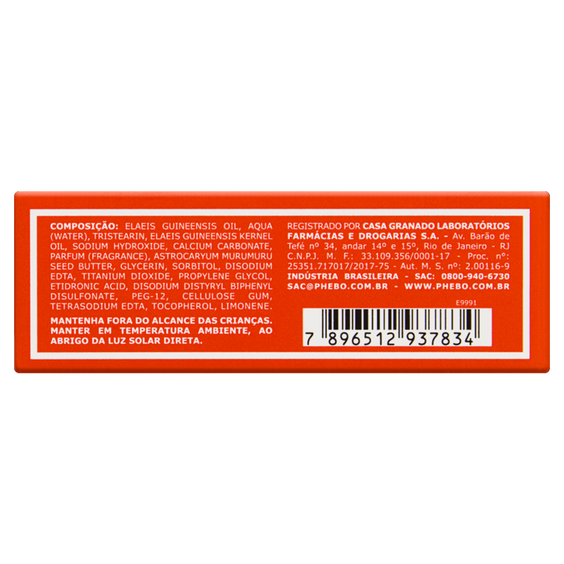 • Composição: Elaeis guineensis oil, aqua (water), tristearin, elaeis guineensis kernel oil, sodium hydroxide, calcium carbonate, parfum (fragrance), astrocaryum murumuru seed butter, glycerin, sorbitol, disodium EDTA, titanium dioxide, propylene glycol, etidronic acid, disodium distryl biphenyl disulfonate, PEG-12, cellulose gum, tetrasodium EDTA, tocopherol, limonene