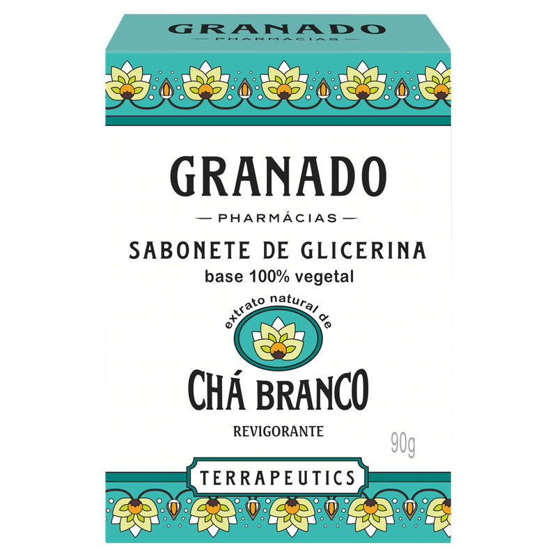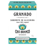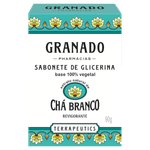 O Sabonete Barra de Glicerina Chá Branco Granado Terrapeutics, com 90g, é um sabonete em barra indicado para limpeza suave da pele, proporcionando maciez e uma leve fragrância refrescante.