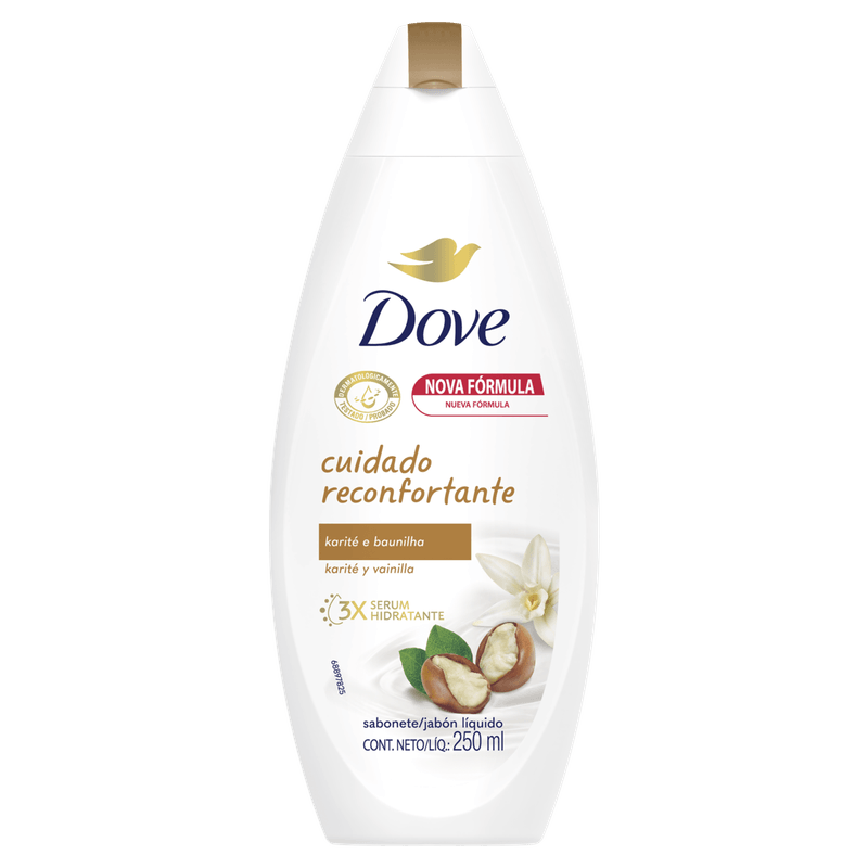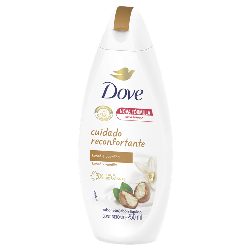 O Sabonete Líquido Cuidado Reconfortante Karité e Baunilha Dove é um sabonete líquido de 250ml indicado para a limpeza diária do corpo, oferecendo uma limpeza suave e hidratação para todos os tipos de pele.