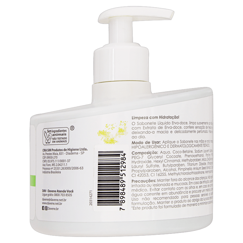 Sabonete Líquido Hidratante Mãos e Rosto Erva-Doce Davene Clássicos da Natureza Frasco 500ml