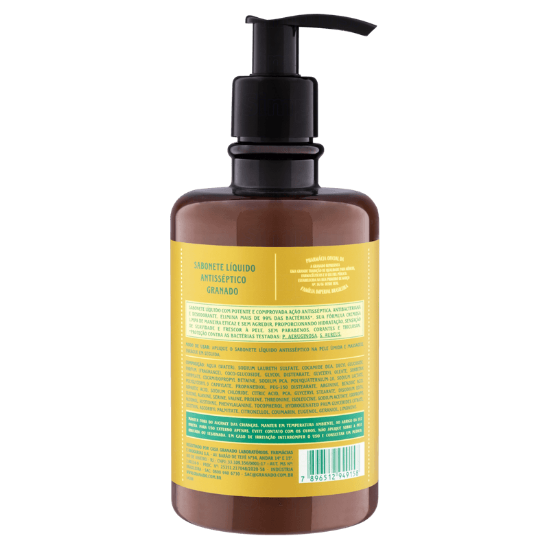 O Sabonete Líquido Antisséptico Granado Tradicional, com base vegetal, oferece potente ação antisséptica, antibacteriana e desodorante, eliminando mais de 99% dos germes e bactérias. Ideal para a higienização diária das mãos, limpa profundamente enquanto promove assepsia, ajudando a prevenir infecções e mantendo a pele macia e fresca por mais tempo.