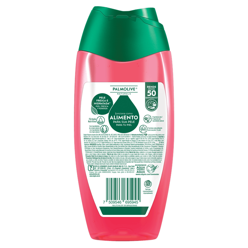 Composição: Água, lauriletersulfato de sódio, cocoamidopropilbetaína, perfume, cloreto de sódio, mea de cocamida, salicilato de sódio, ácido cítrico, benzoato de sódio, poliquatérnio-7, edetato de sódio, sulisobenzona, diestearato de etilenoglicol, acetato de tocoferila, lauromacrogol 400, glicerol, suco do fruto de citrullus lanatus, suco do fruto litchi chinensis, corantes e componentes da fragrância. Produto não tóxico.