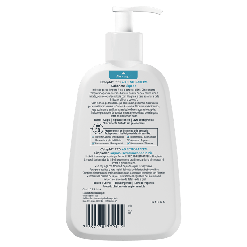 Este sabonete líquido atua restaurando a pele muito seca e irritada, proporcionando limpeza eficaz sem ressecar. Sua composição sem sabão e sem perfume o torna seguro para peles sensíveis, com textura leve e fácil aplicação graças ao frasco com pump de 236 ml. Indicado para toda a família, especialmente para quem sofre com dermatite atópica ou outras condições que exigem cuidado extra.