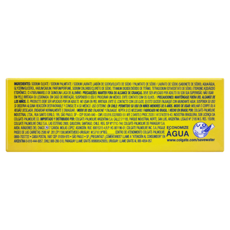 Oleato de sódio/palmitato de sódio/laurato de sódio (sabonete de sódio), água, glicerol, caulim, perfume, cloreto de sódio, dióxido de titânio, edetato de sódio, ácido etidrônico, amarelo de quinolina laca de alumínio.