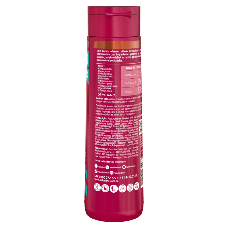 O Shampoo para Cachos SOS Poderosos 300ml da Salon Line é ideal para cabelos ondulados, cacheados e crespos, oferecendo uma limpeza suave que preserva a hidratação natural dos fios. Com benefícios de reparação, definição e brilho, este shampoo potencializa a saúde e a beleza dos cachos, deixando-os mais fortes, definidos e radiantes.