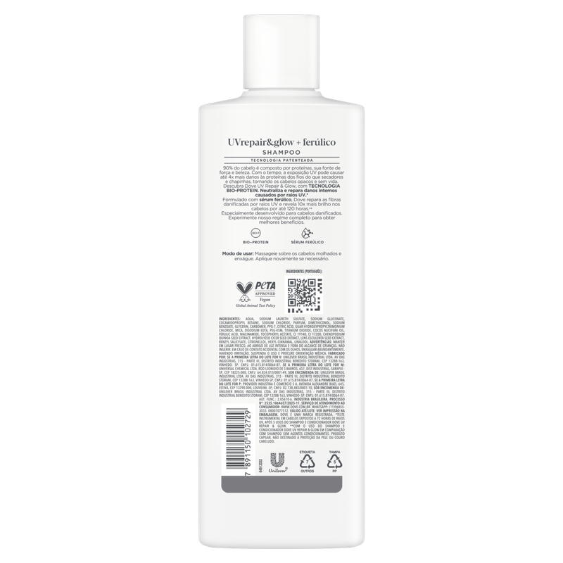 O Shampoo Dove UV Repair e Glow + Ferúlico 370ml limpa delicadamente enquanto protege os cabelos contra os danos causados pela exposição solar. Enriquecido com ácido ferúlico e ativos reparadores, ajuda a restaurar os fios, preservando sua vitalidade e brilho natural. Indicado para todos os tipos de cabelo, promove limpeza eficaz, hidratação leve e aparência saudável, mantendo os fios radiantes e resistentes.
