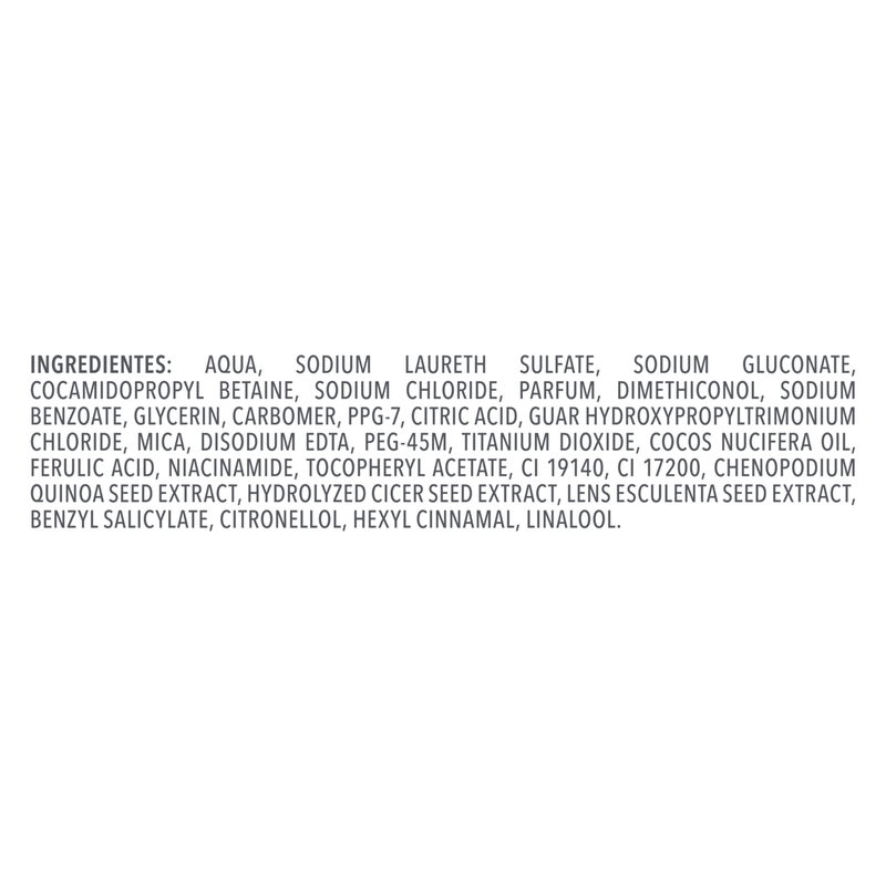Aqua, sodium laureth sulfate, sodium gluconate, cocamidopropyl betaine, sodium chloride, parfum, dimethiconol, sodium benzoate, glycerin, carbomer, PPG-7, citric acid, guar hydroxypropyltrimonium chloride, mica, disodium EDTA, PEG-45M, titanium dioxide, cocos nucifera oil, ferulic acid, niacinamide, tocopheryl acetate, CI 19140, CI 17200, chenopodium quinoa seed extract, hydrolyzed cicer seed extract, lens esculenta seed extract, benzyl salicylate, citronellol, hexyl cinnamal, linalool.