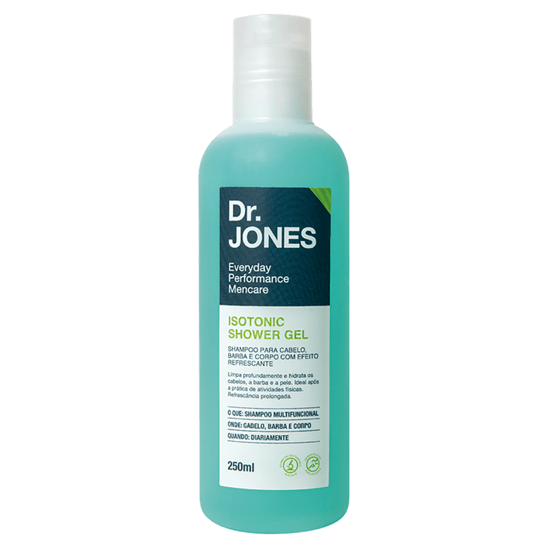 Indicado para limpar e refrescar cabelo, barba e corpo, o shampoo Dr. Jones Isotonic Shower Gel ajuda a pele a restaurar seu equilíbrio natural, hidrata cabelo e barba e repõe os minerais perdidos com a transpiração.
