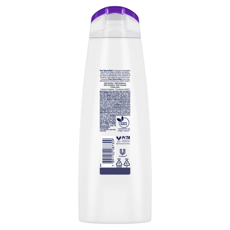 O Shampoo Dove Texturas Reais Crespos 355 ml é especialmente formulado para cabelos crespos, oferecendo uma limpeza suave que respeita a estrutura natural dos fios. Sua fórmula hidrata e nutre profundamente, ajudando a manter os cachos definidos, macios e com brilho, sem ressecar o couro cabeludo.