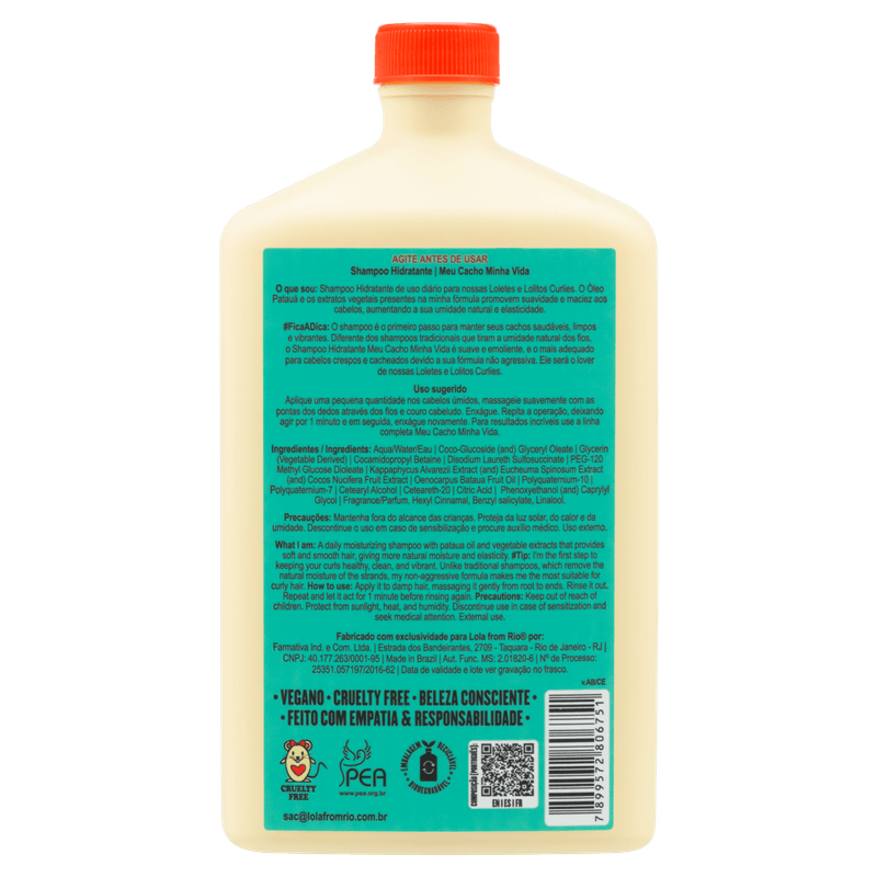 Shampoo Hidratante Lola Meu Cacho Minha Vida possui em sua fórmula Óleo de Patauá e Extratos Vegetais, que promovem suavidade e maciez, aumentando a sua umidade natural e a elasticidade dos fios. Não contém glúten, sulfatos, corantes sintéticos, ftalatos, parafina, silicone insolúvel, derivados de animais, parabenos, OGMs, cloreto de sódio e óleo minera.